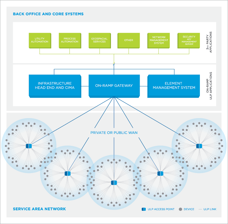 - The ULP Gateway (GW), managing connections to the APs in a network, handover between APs and the data path to the back-end applications.